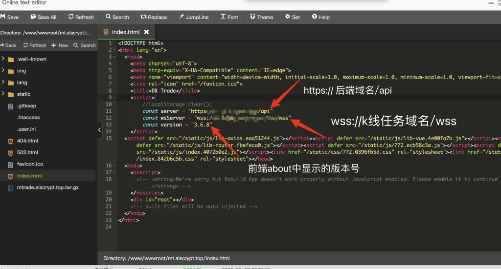 修改前端网站index.html文件内容,里面的域名改为后台的地址和ws地址